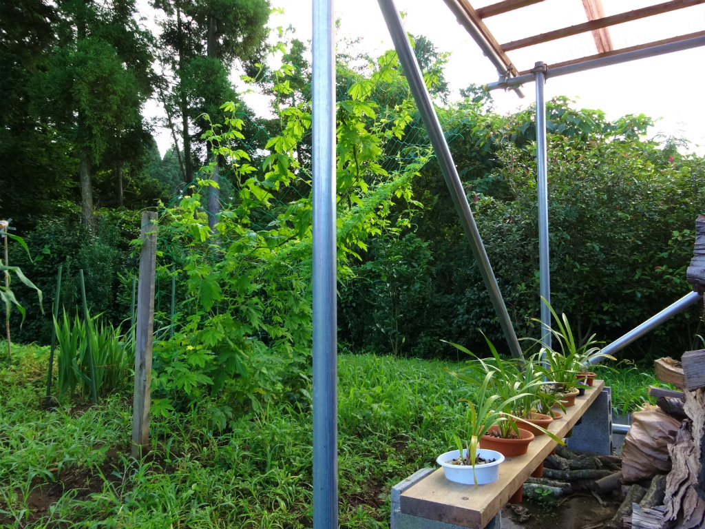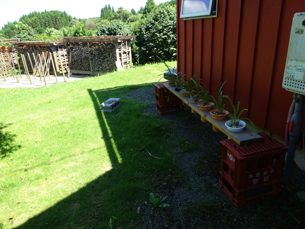 薪小屋3号の空きスペースに置いて、ゴーヤの、緑のカーテンで日陰、なんて考えていたんですが、日差しが思ったより強烈にキンリョウヘンにあたります。